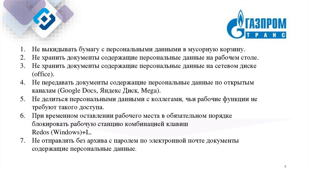 1. Не выкидывать бумагу с персональными данными в мусорную корзину.2. Не хранить документы содержащие персональные данные на рабочем столе.