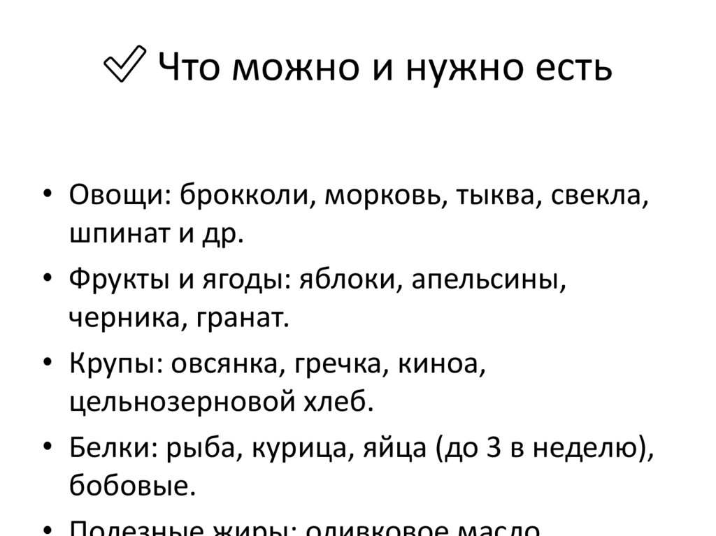 ✅ Что можно и нужно есть• Овощи: брокколи, морковь, тыква, свекла,