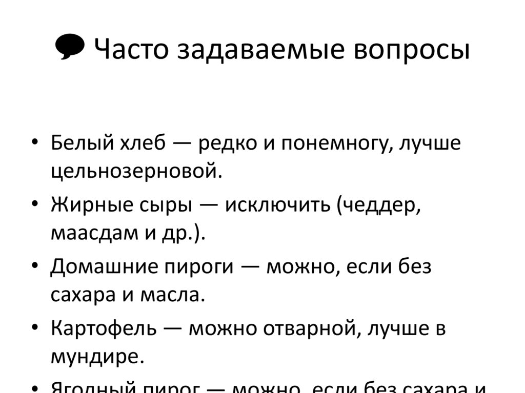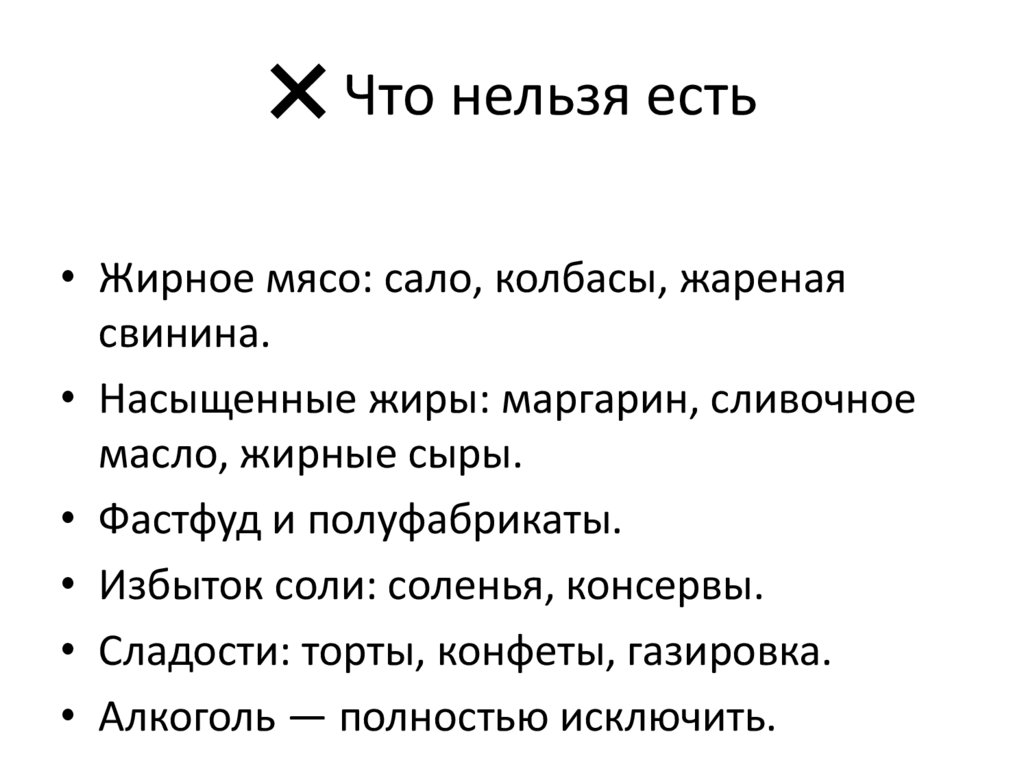 ❌ Что нельзя есть• Жирное мясо: сало, колбасы, жареная