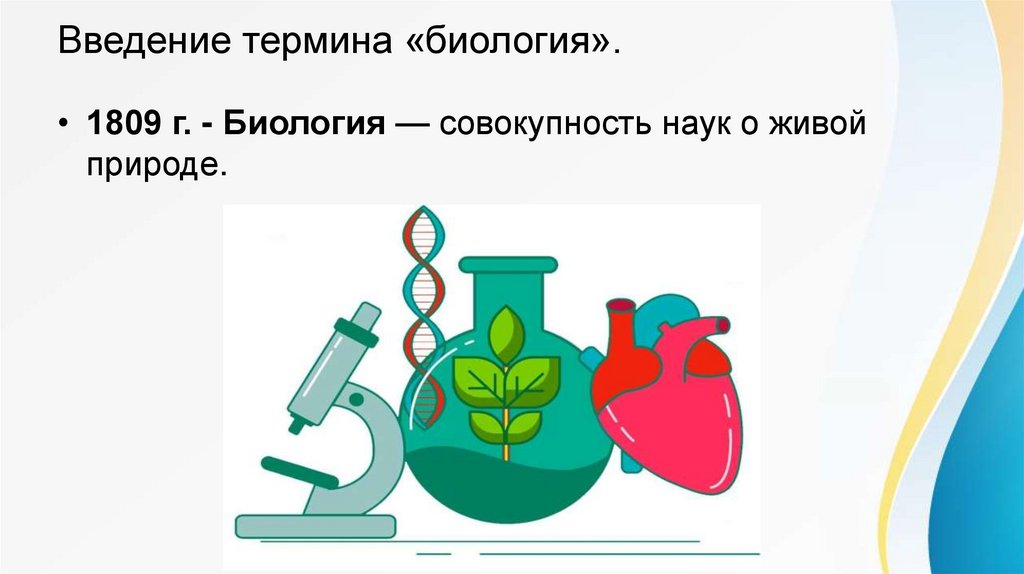 Введение термина «биология».• 1809 г. - Биология — совокупность наук о живой