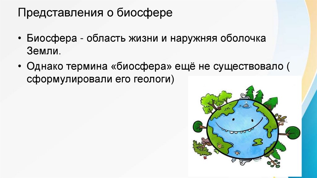 Представления о биосфере• Биосфера - область жизни и наружняя оболочка