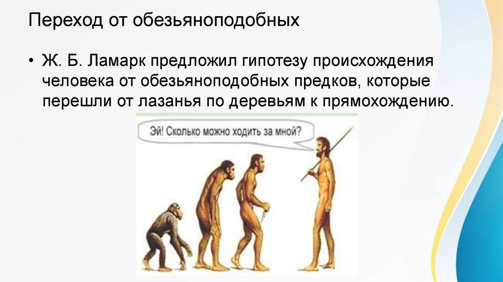 Переход от обезьяноподобных• Ж. Б. Ламарк предложил гипотезу происхождения