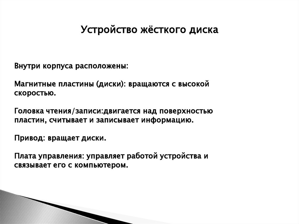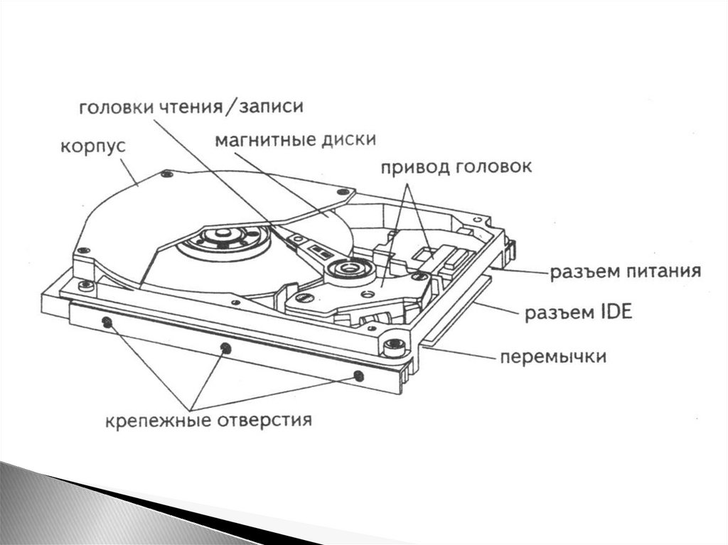 Устройство жёсткого дискаВнутри корпуса расположены: