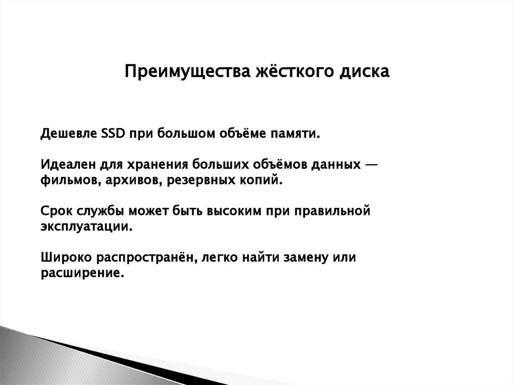 Преимущества жёсткого дискаДешевле SSD при большом объёме памяти.