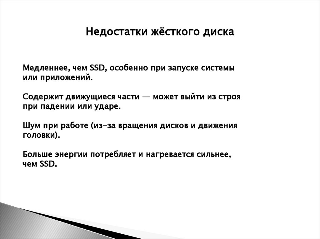 Недостатки жёсткого дискаМедленнее, чем SSD, особенно при запуске системы