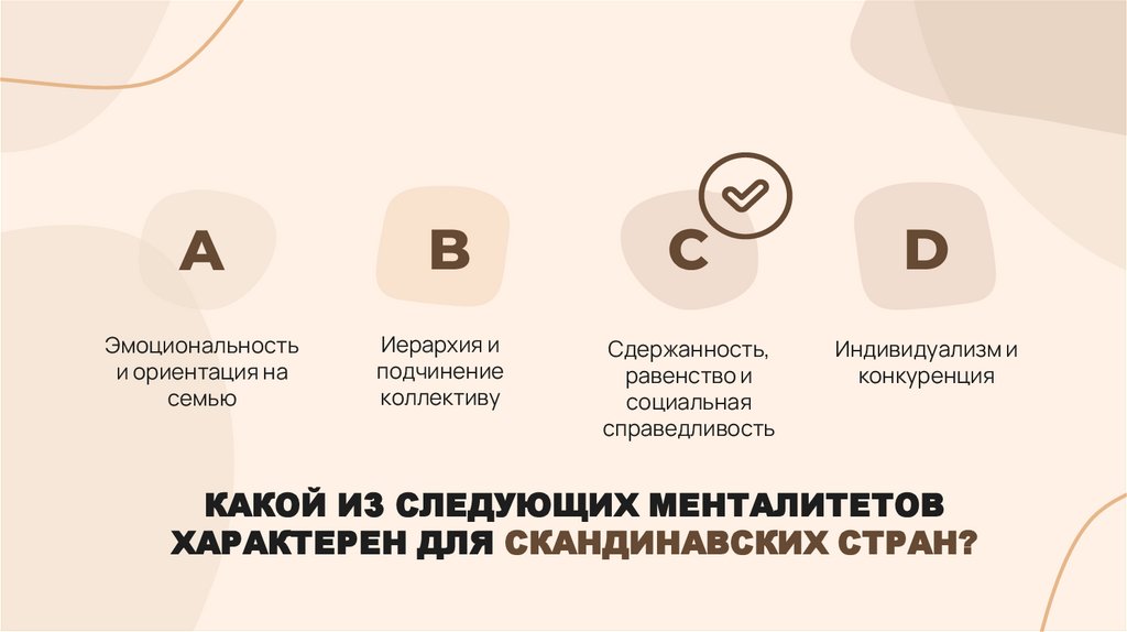 12. Какой из следующих менталитетов характерен для скандинавских стран?