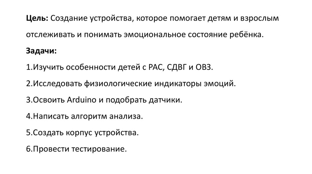 Цель: Создание устройства, которое помогает детям и взрослымотслеживать и понимать эмоциональное состояние ребёнка.
