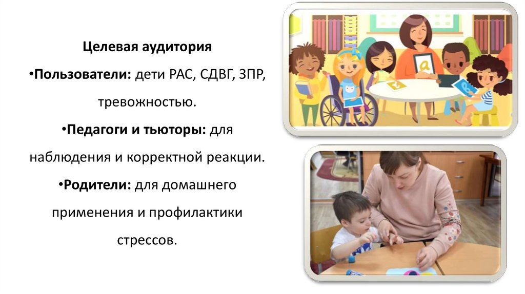 Целевая аудитория•Пользователи: дети РАС, СДВГ, ЗПР,