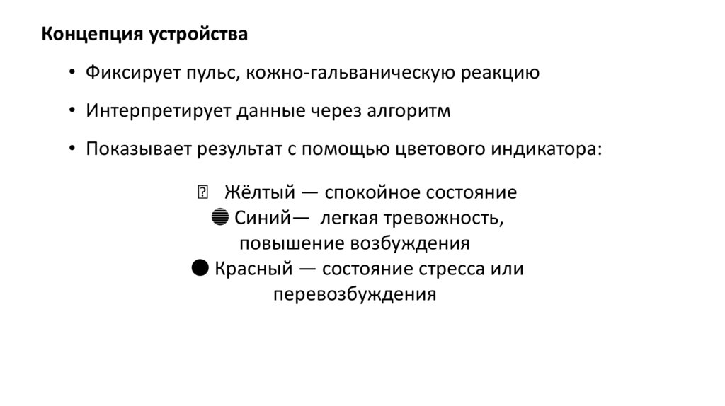 Концепция устройства• Фиксирует пульс, кожно-гальваническую реакцию