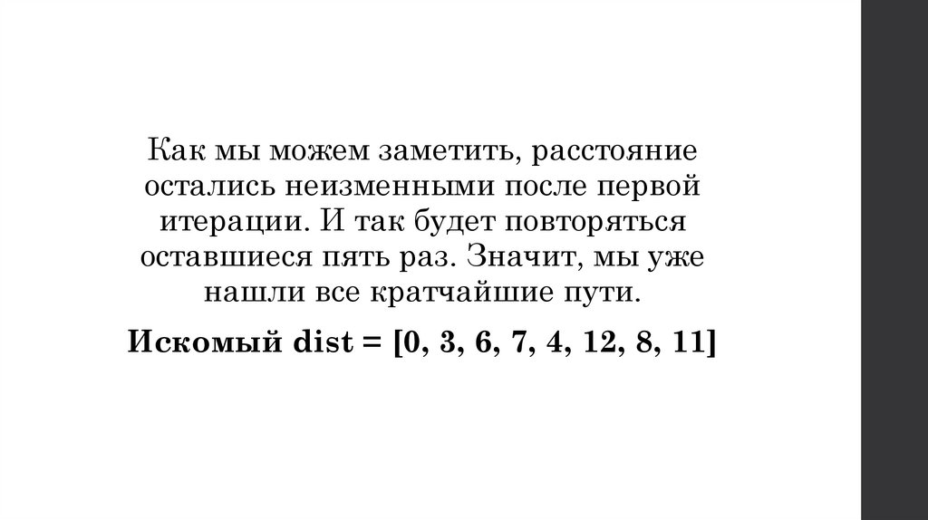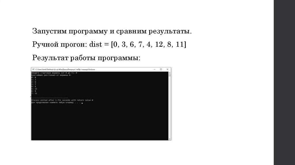 Запустим программу и сравним результаты.Ручной прогон: dist = [0, 3, 6, 7, 4, 12, 8, 11]