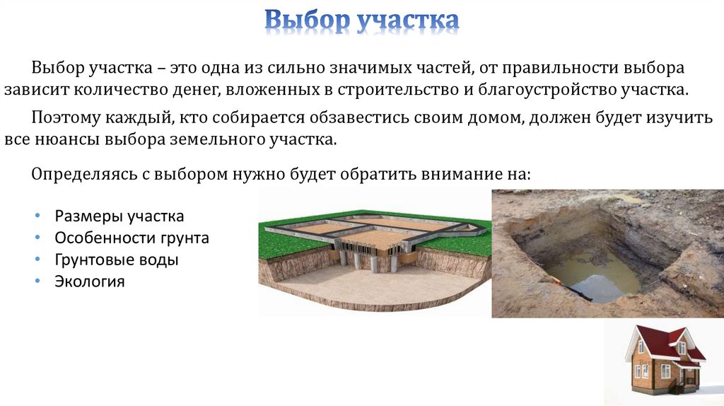 Выбор участка – это одна из сильно значимых частей, от правильности выборазависит количество денег, вложенных в строительство и благоустройство участка.