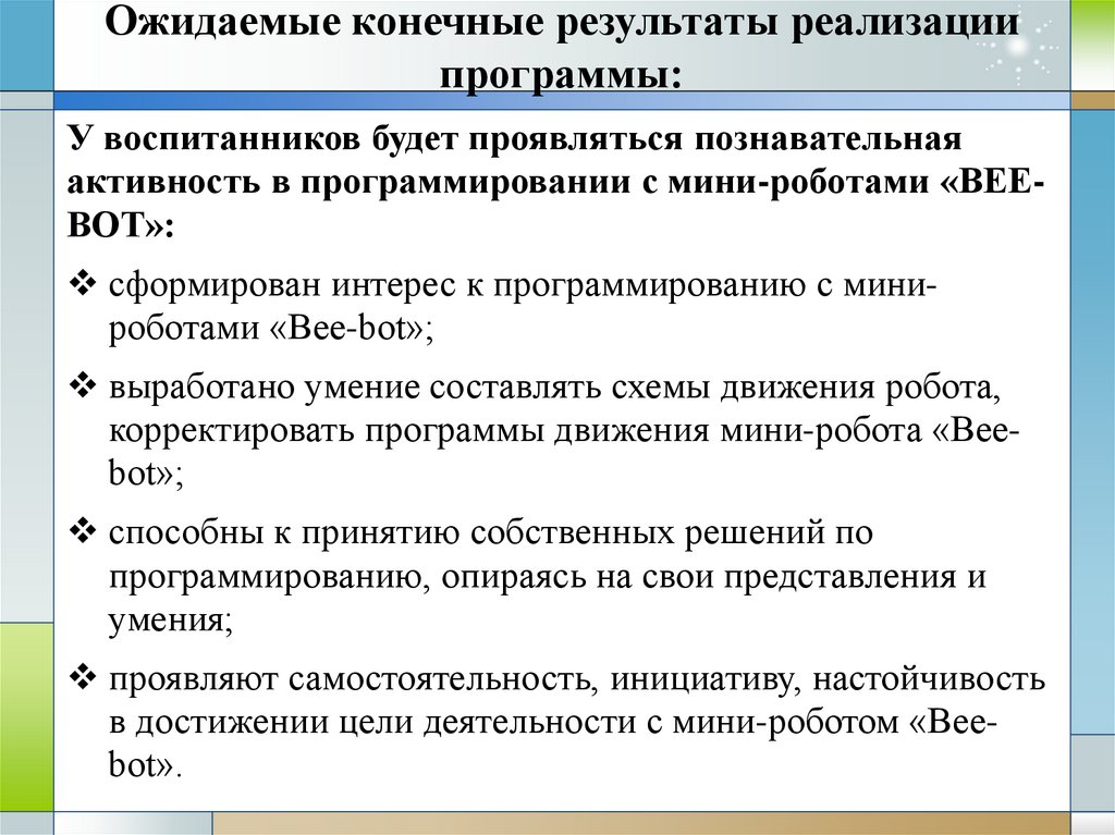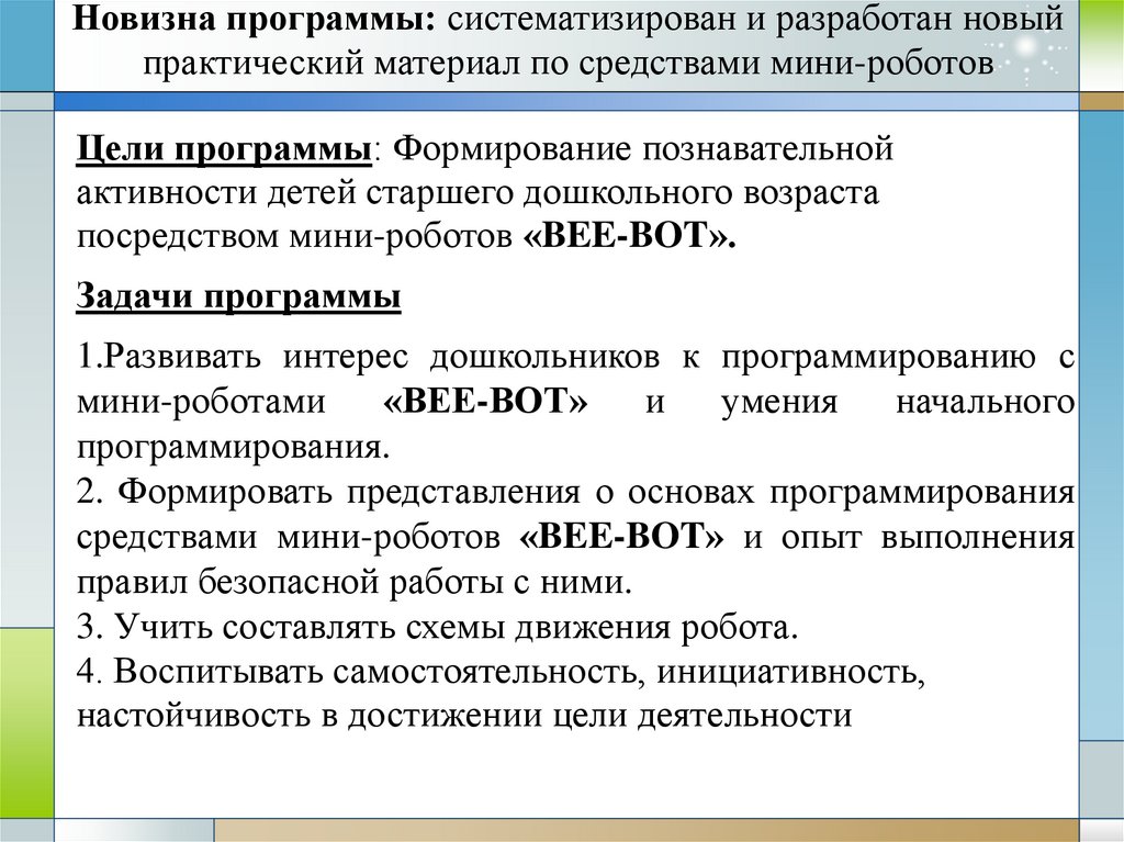 3. Новизна программы: систематизирован и разработан новый практический материал по средствами мини-роботов