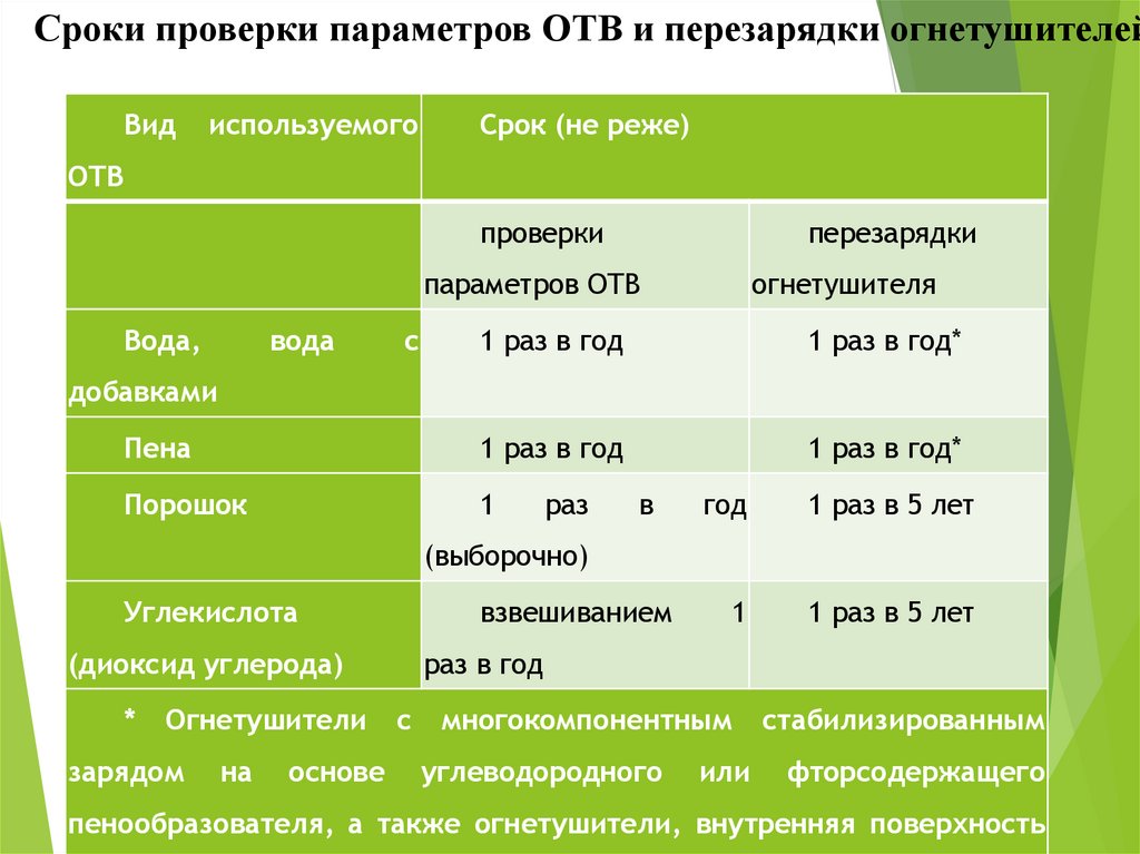 Сроки проверки параметров ОТВ и перезарядки огнетушителейВид