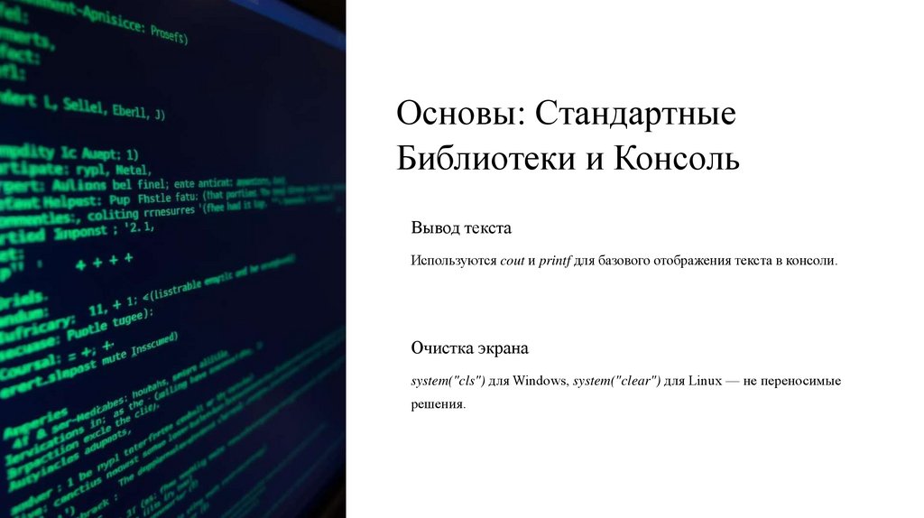 system("cls") для Windows, system("clear") для Linux — не переносимые