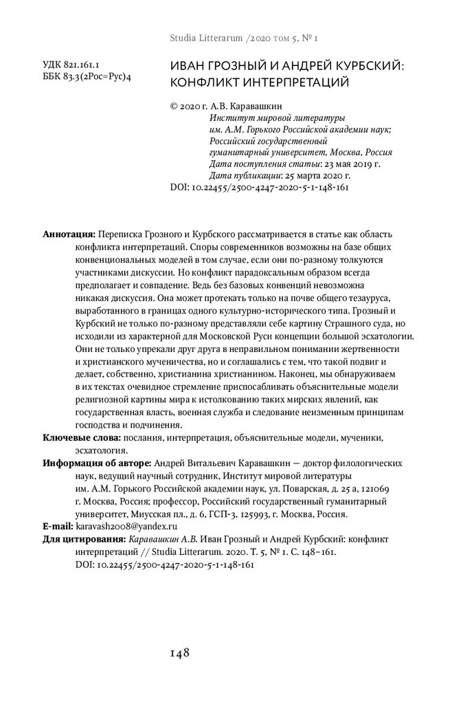 For citation: Karavashkin A.V. Ivan the Terrible and Andrey Kurbsky: a Conflict of