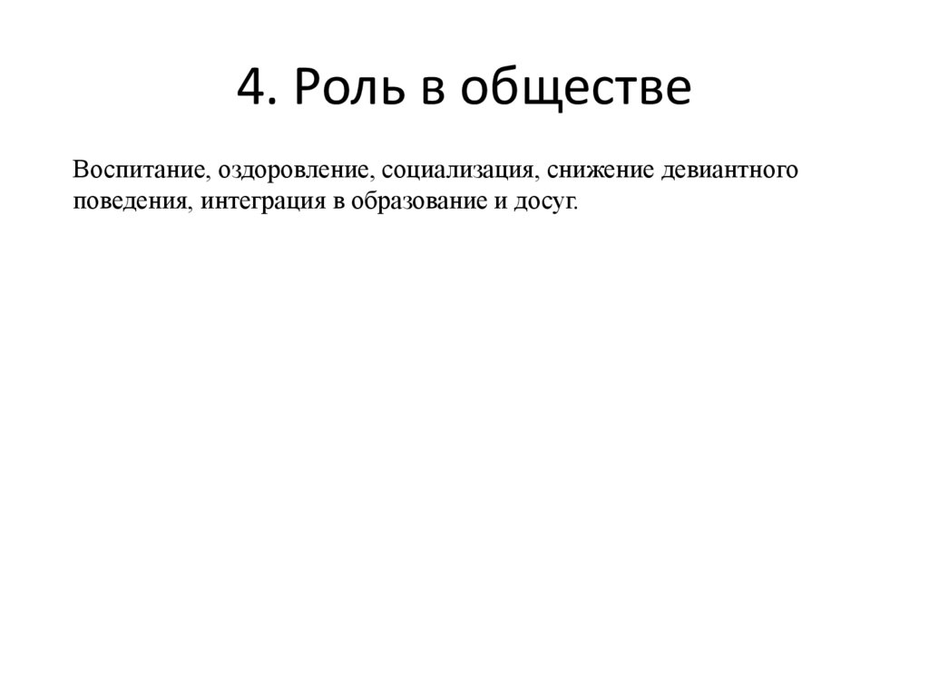4. Роль в обществеВоспитание, оздоровление, социализация, снижение девиантного