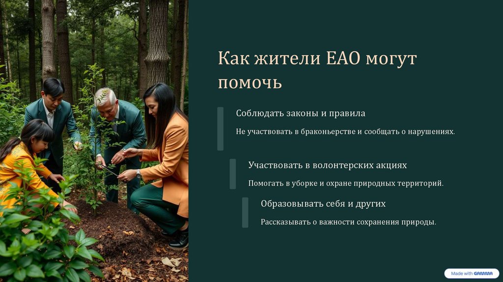 Помогать в уборке и охране природных территорий.