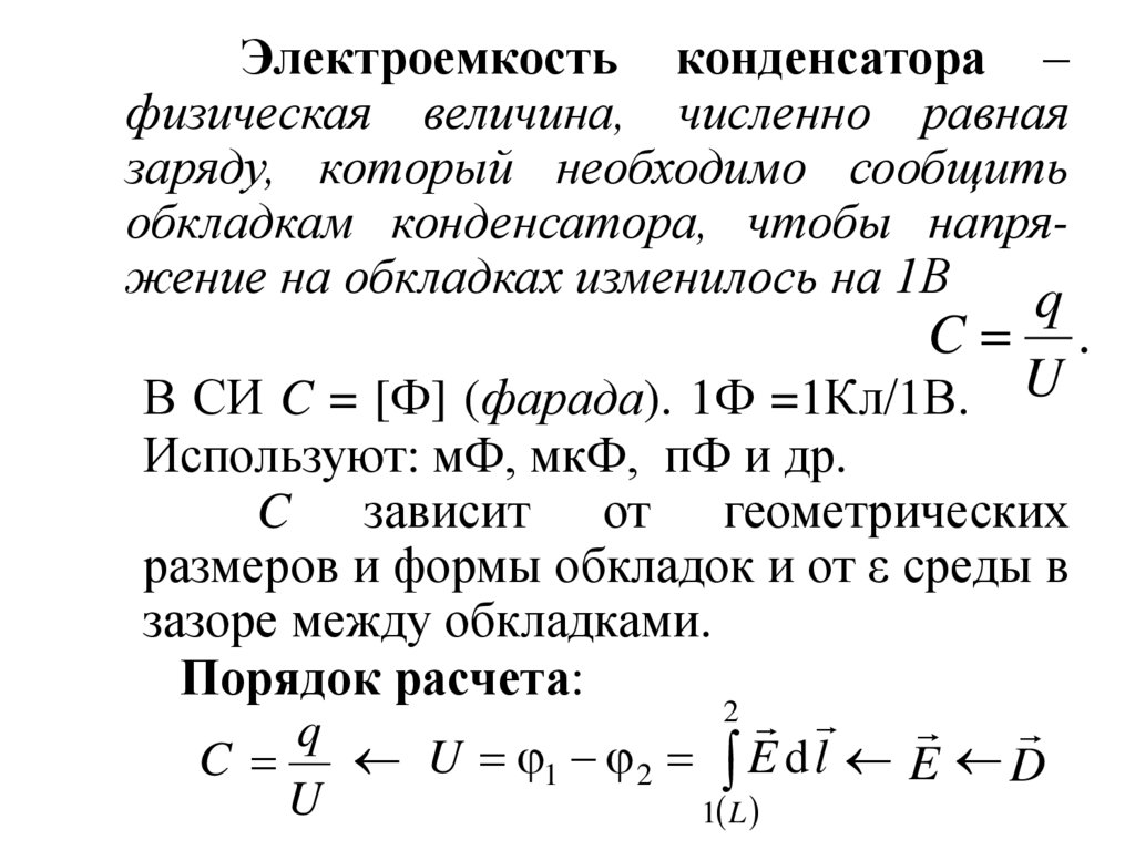 В СИ C = [Ф] (фарада). 1Ф =1Кл/1В. U