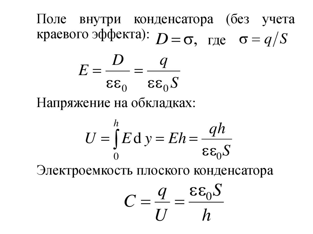 Поле внутри конденсатора (без учетакраевого эффекта): D , где q S