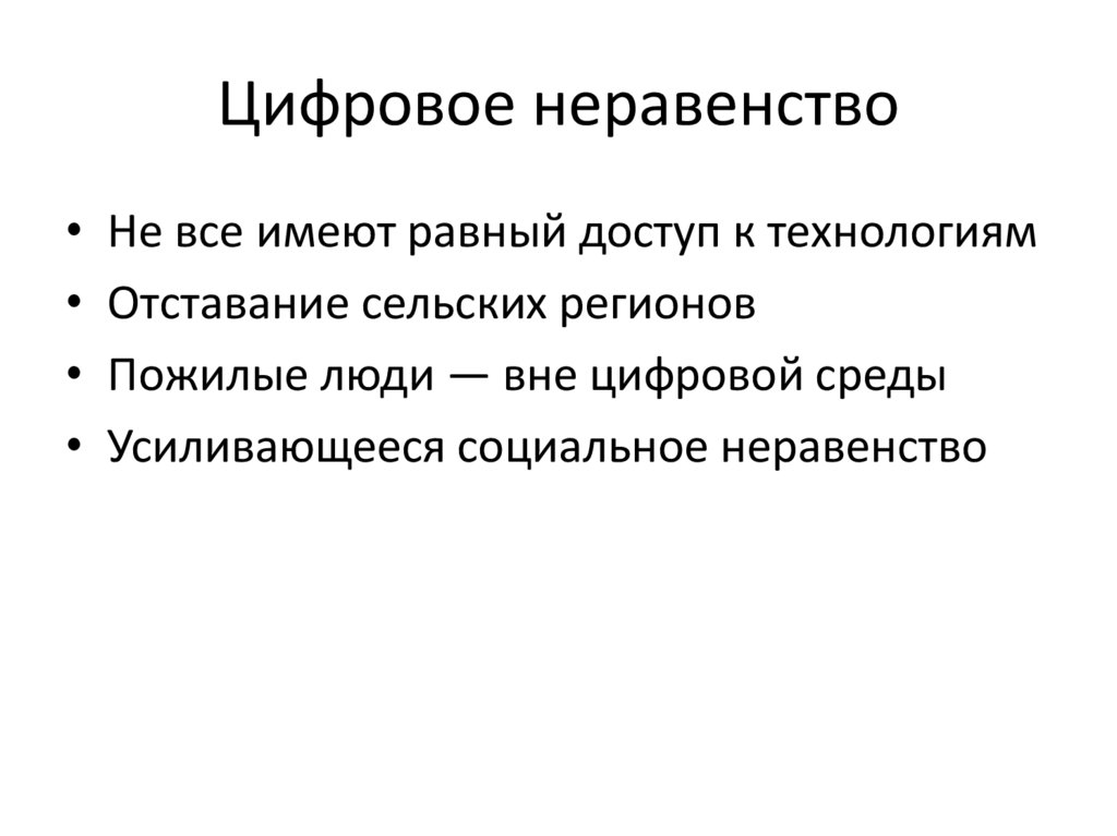 Цифровое неравенство• Не все имеют равный доступ к технологиям