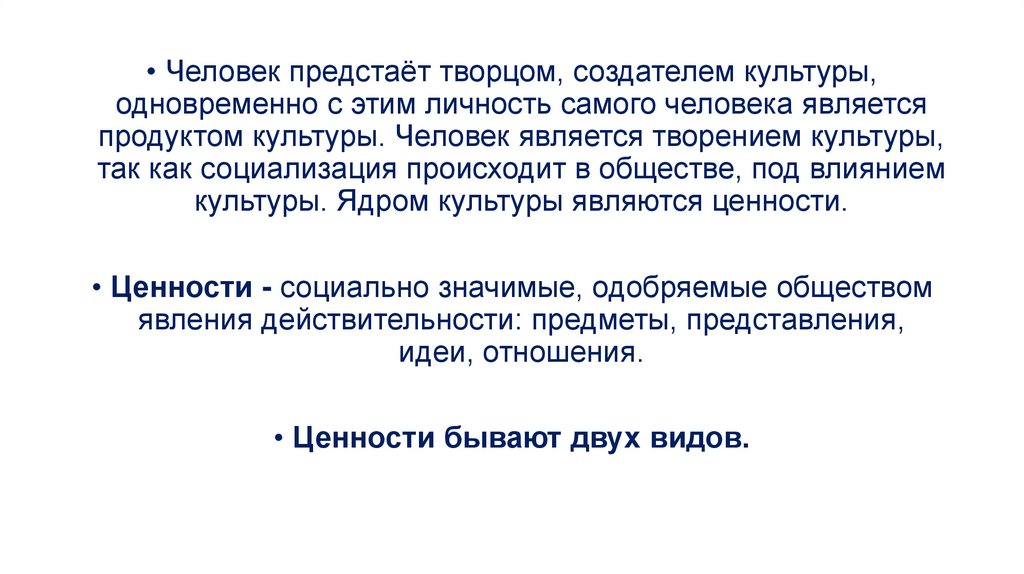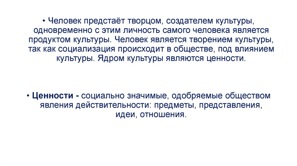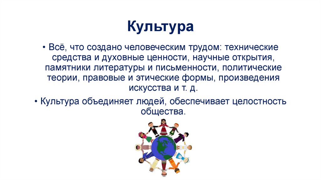 • Культура отличает человека от других живых существ;• Через культуру происходит социальное наследование,