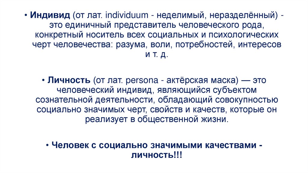 • Индивид (от лат. individuum - неделимый, неразделённый) это единичный представитель человеческого рода,конкретный носитель всех социальных и психологических