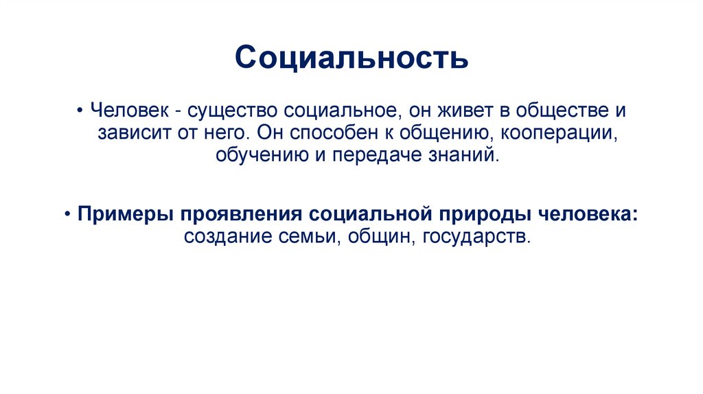 • Человек - существо социальное, он живет в обществе изависит от него. Он способен к общению, кооперации,