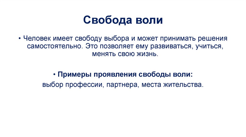 • Человек имеет свободу выбора и может принимать решениясамостоятельно. Это позволяет ему развиваться, учиться,