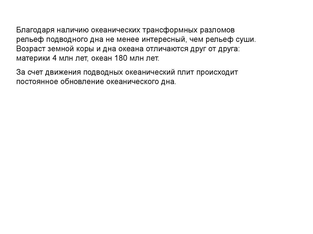 Благодаря наличию океанических трансформных разломоврельеф подводного дна не менее интересный, чем рельеф суши.