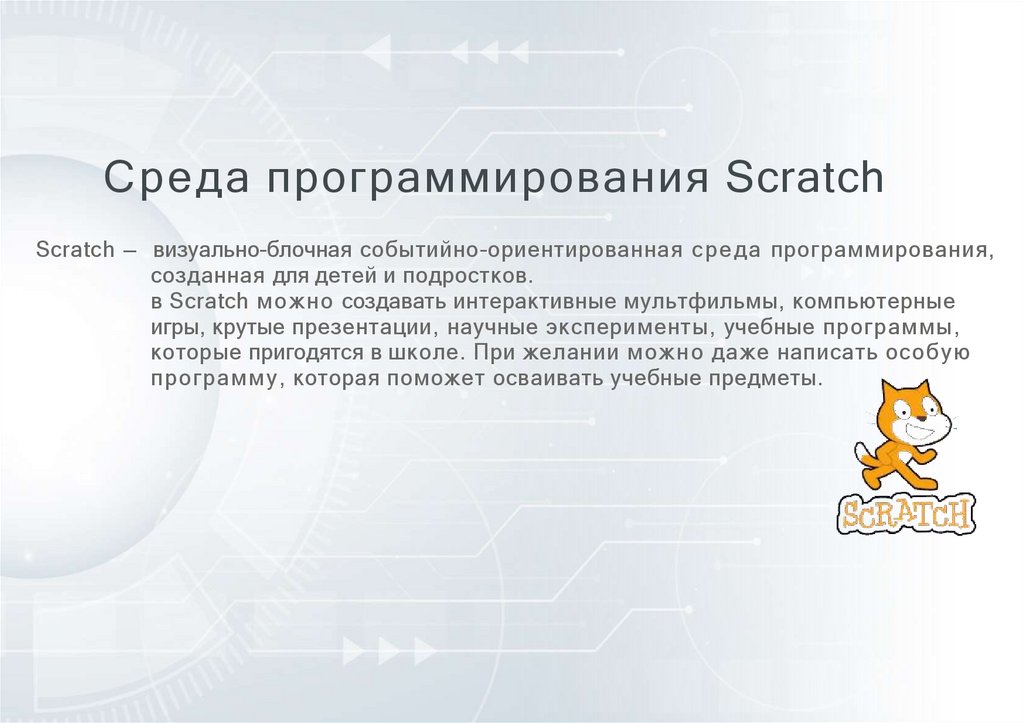 Среда программирования ScratchScratch — визуально-блочная событийно-ориентированная среда программирования,