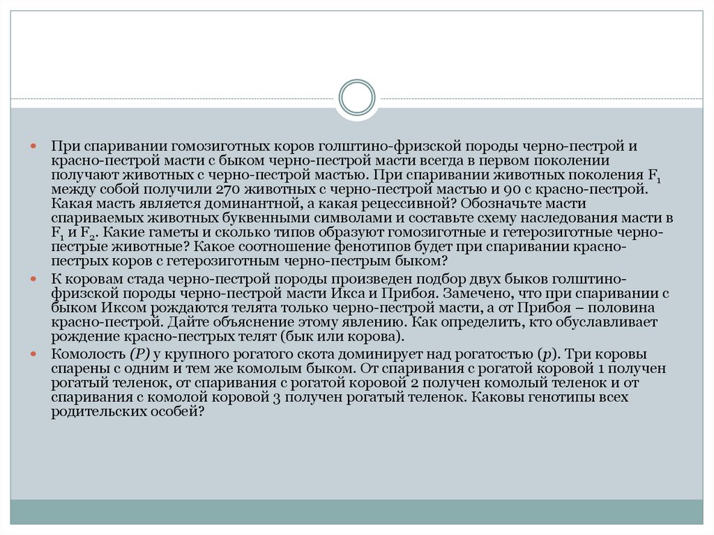 F1 и F2. Какие гаметы и сколько типов образуют гомозиготные и гетерозиготные чернопестрые животные? Какое соотношение фенотипов будет при спаривании краснопестрых коров с гетерозиготным черно-пестрым быком?