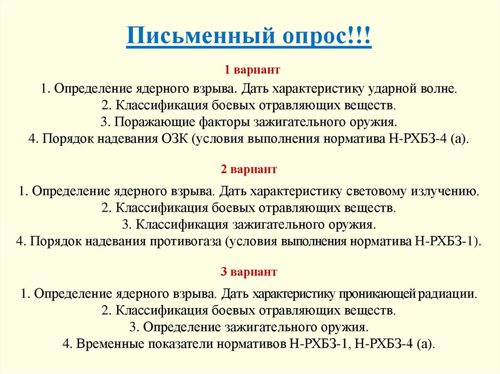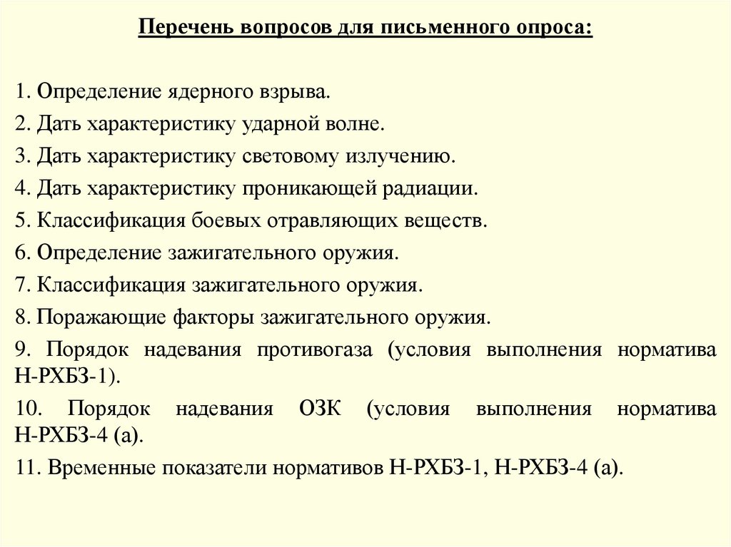 Перечень вопросов для письменного опроса:1. Определение ядерного взрыва.