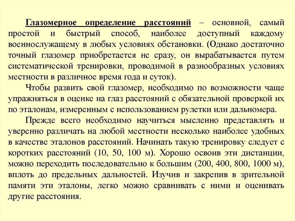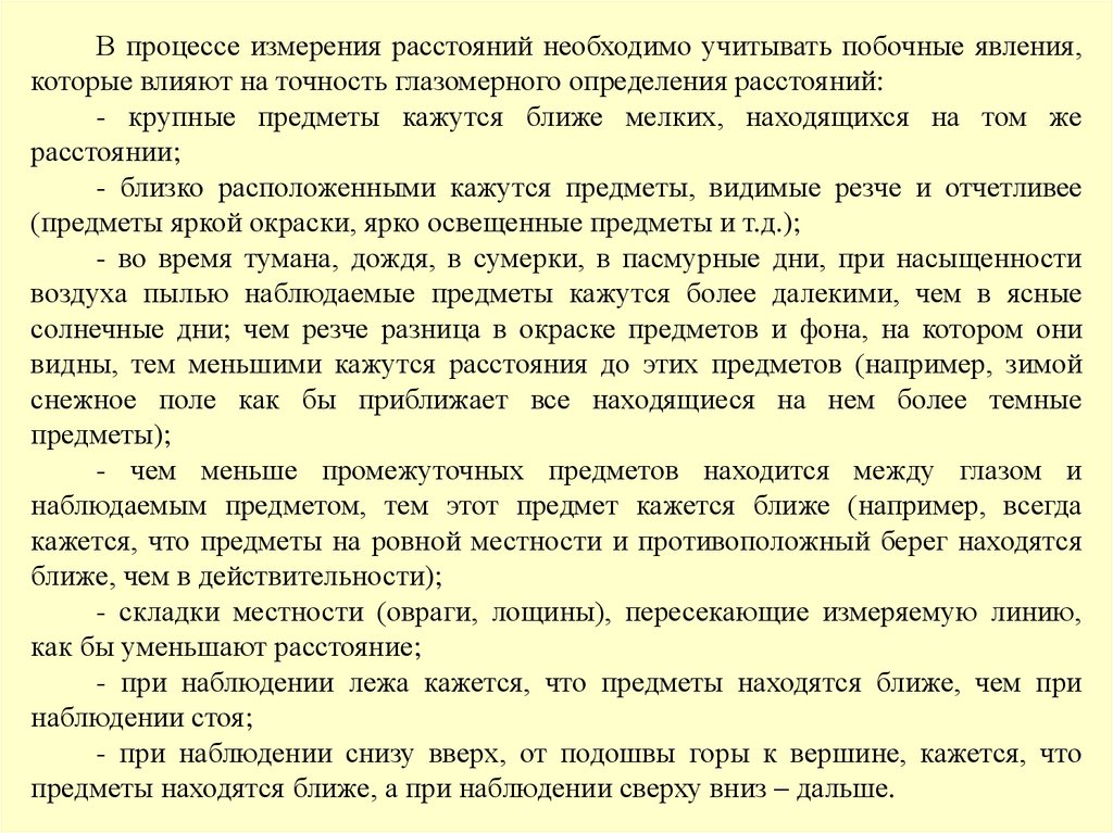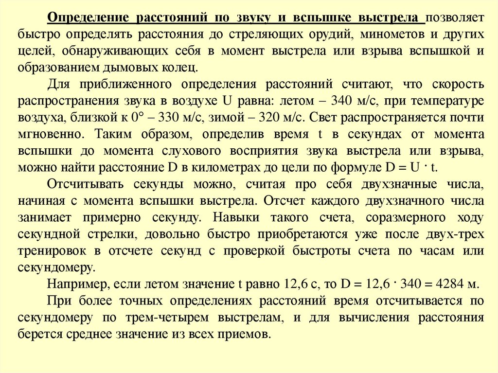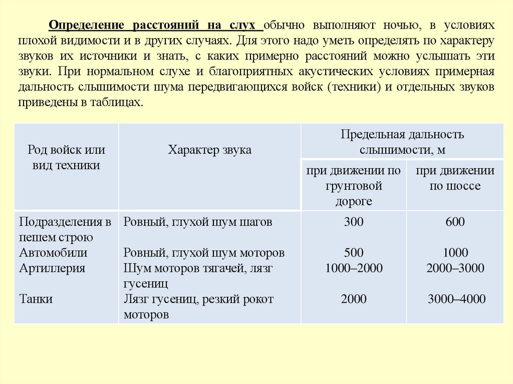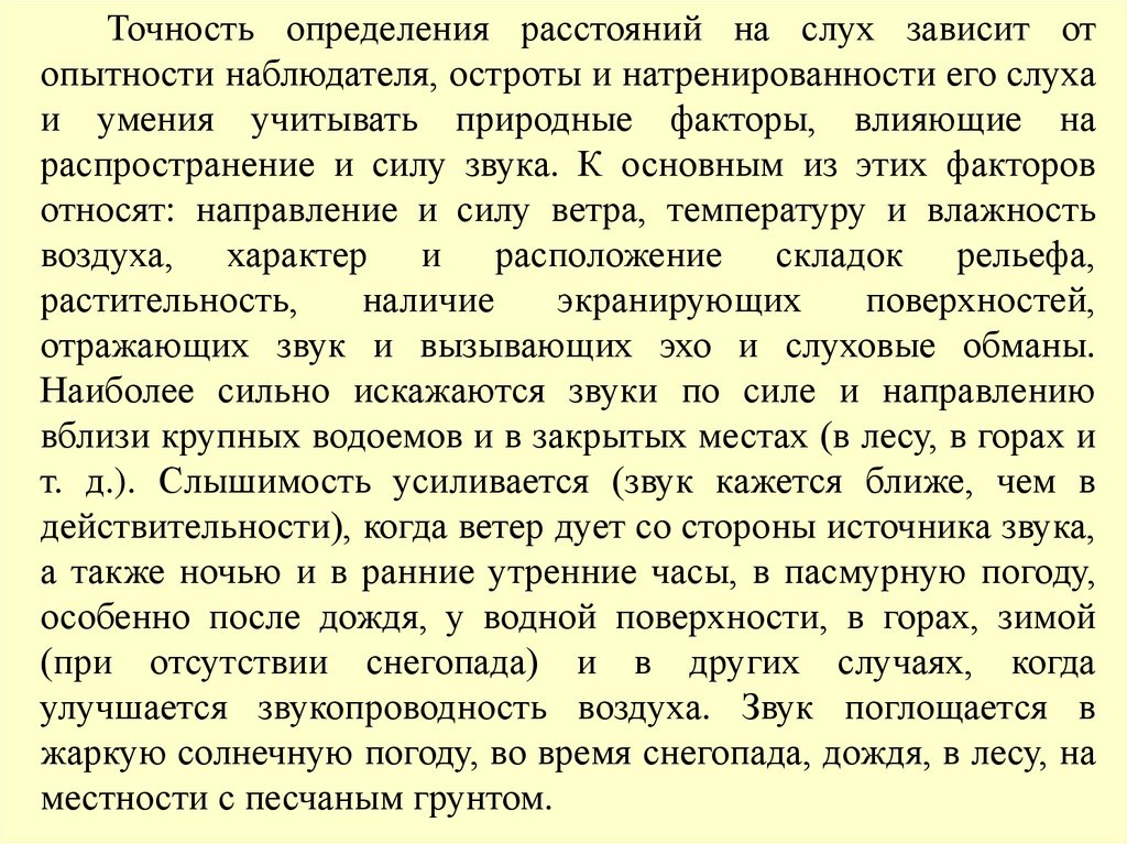 Точность определения расстояний на слух зависит отопытности наблюдателя, остроты и натренированности его слуха