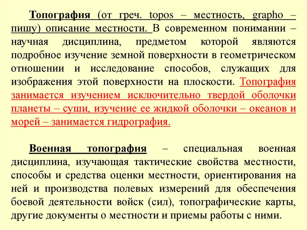 Топография (от греч. topos – местность, grapho –пишу) описание местности. В современном понимании –