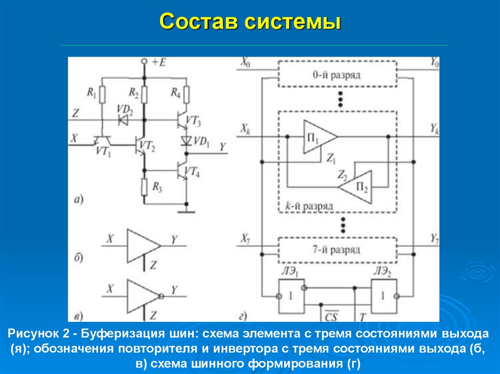 Рисунок 2 - Буферизация шин: схема элемента с тремя состояниями выхода(я); обозначения повторителя и инвертора с тремя состояниями выхода (б,