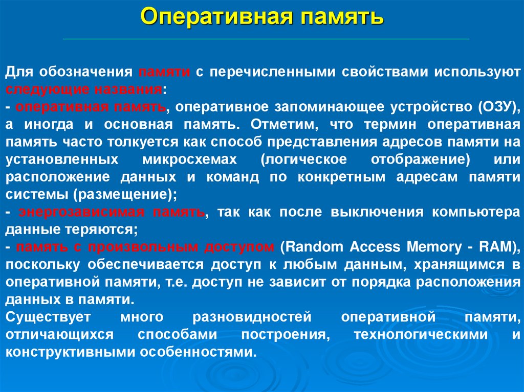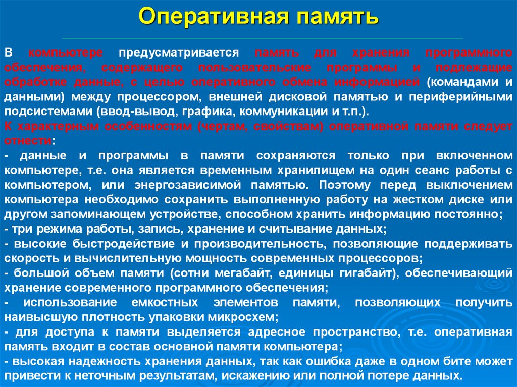 К характерным особенностям (чертам, свойствам) оперативной памяти следует