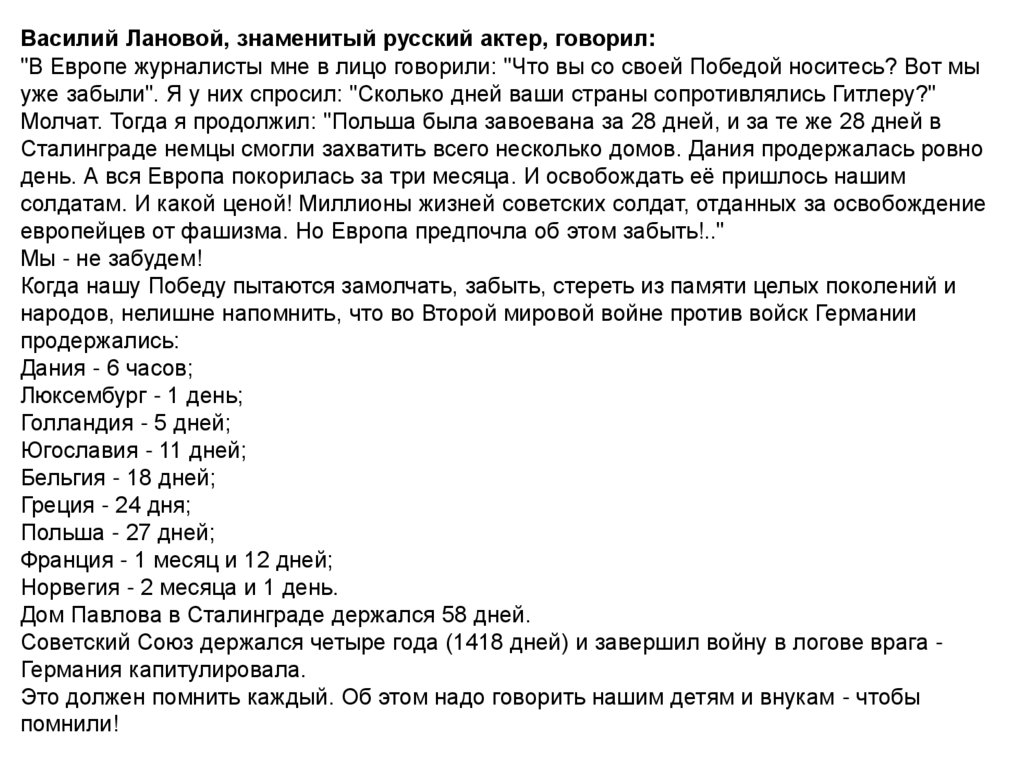 Василий Лановой, знаменитый русский актер, говорил:"В Европе журналисты мне в лицо говорили: "Что вы со своей Победой носитесь? Вот мы