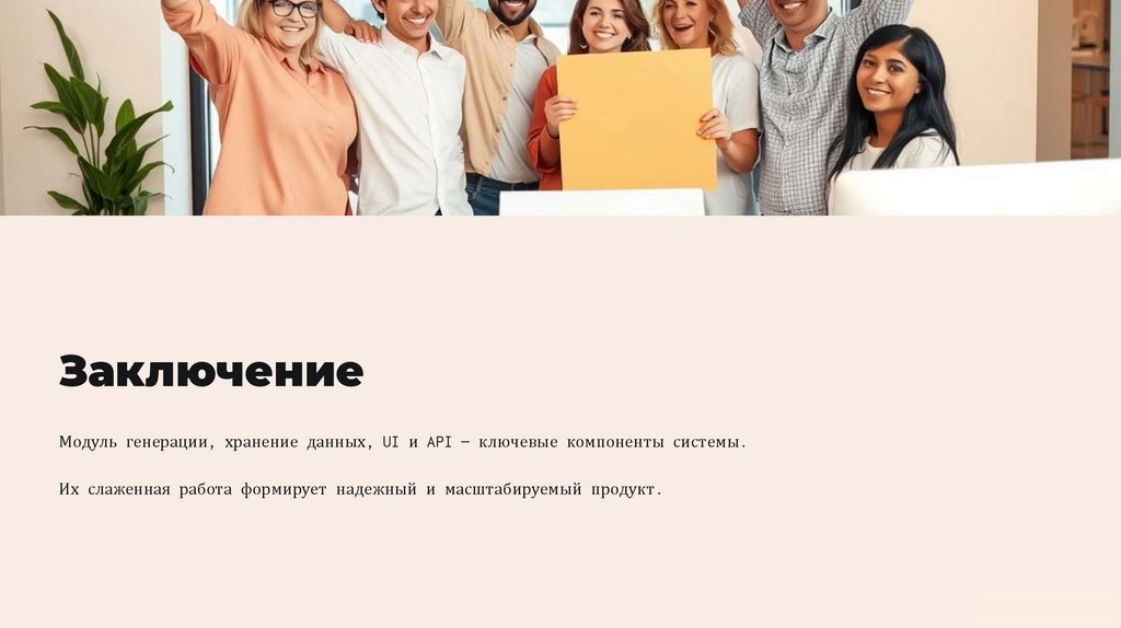 ЗаключениеМодуль генерации, хранение данных, UI и API — ключевые компоненты системы.