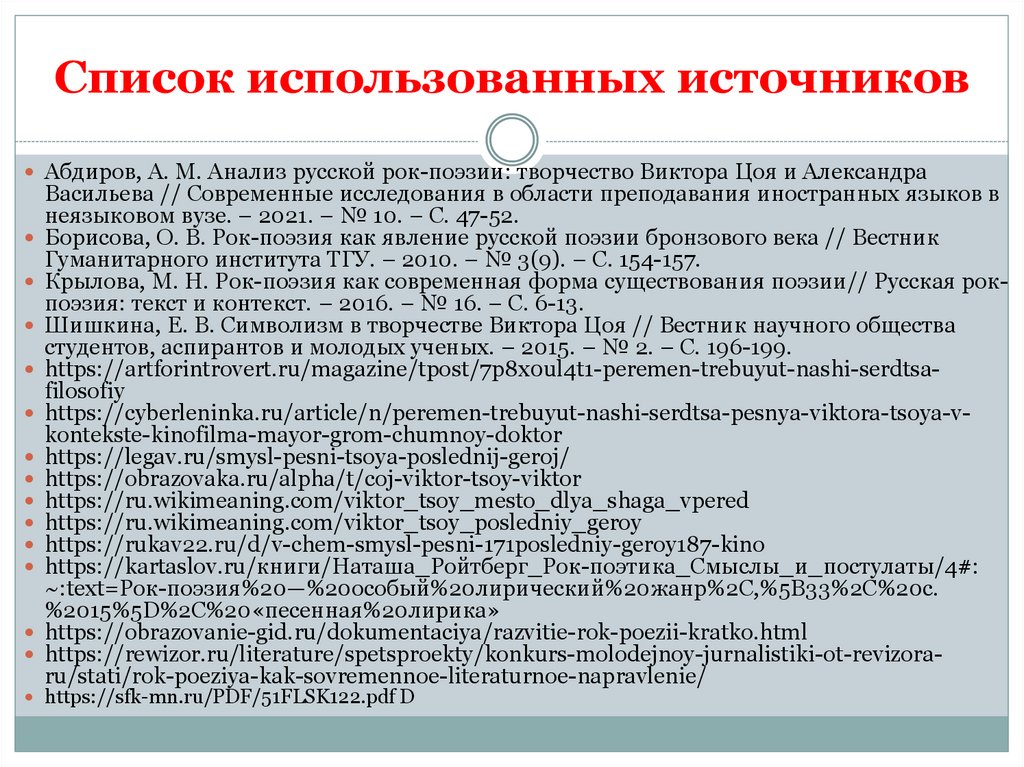 Крылова, М. Н. Рок-поэзия как современная форма существования поэзии// Русская рокпоэзия: текст и контекст. – 2016. – № 16. – С. 6-13.