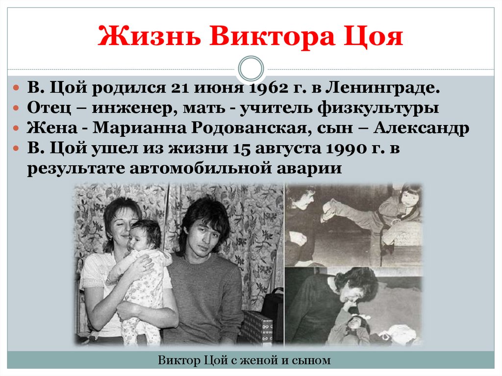 В. Цой родился 21 июня 1962 г. в Ленинграде.Отец – инженер, мать - учитель физкультуры