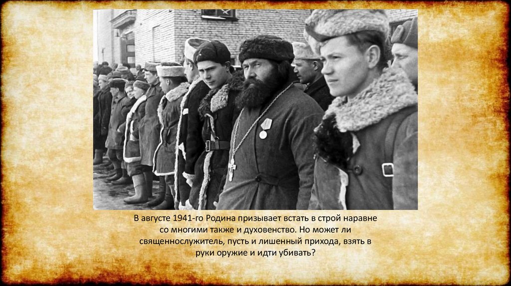 В августе 1941-го Родина призывает встать в строй наравнесо многими также и духовенство. Но может ли