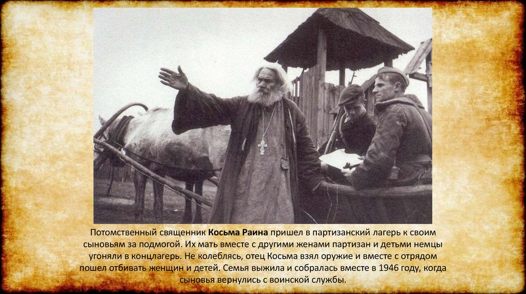 Потомственный священник Косьма Раина пришел в партизанский лагерь к своимсыновьям за подмогой. Их мать вместе с другими женами партизан и детьми немцы