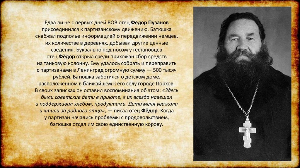 Едва ли не с первых дней ВОВ отец Федор Пузановприсоединился к партизанскому движению. Батюшка
