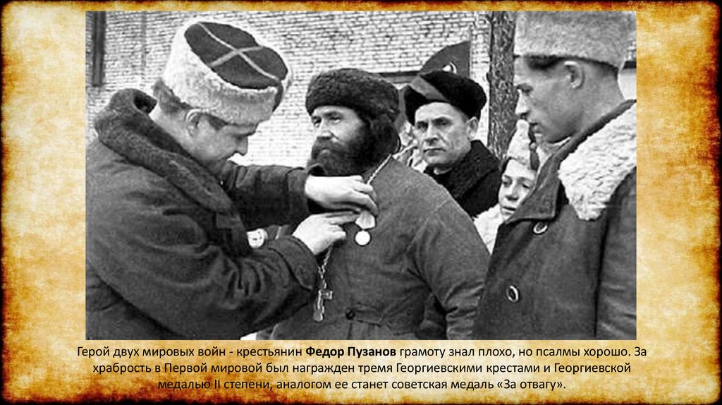 Герой двух мировых войн - крестьянин Федор Пузанов грамоту знал плохо, но псалмы хорошо. Захрабрость в Первой мировой был награжден тремя Георгиевскими крестами и Георгиевской