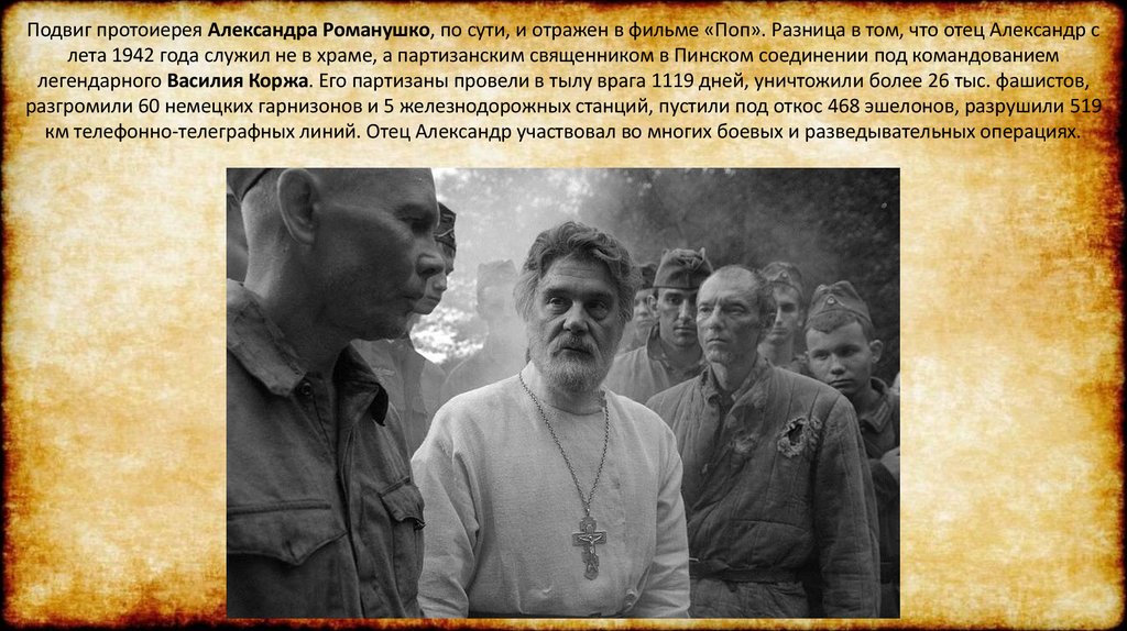 Подвиг протоиерея Александра Романушко, по сути, и отражен в фильме «Поп». Разница в том, что отец Александр слета 1942 года служил не в храме, а партизанским священником в Пинском соединении под командованием