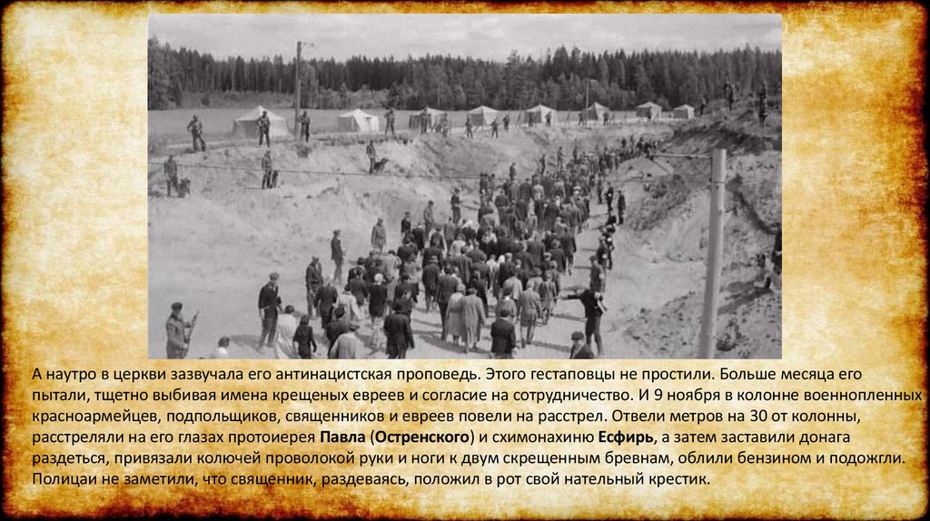 А наутро в церкви зазвучала его антинацистская проповедь. Этого гестаповцы не простили. Больше месяца егопытали, тщетно выбивая имена крещеных евреев и согласие на сотрудничество. И 9 ноября в колонне военнопленных