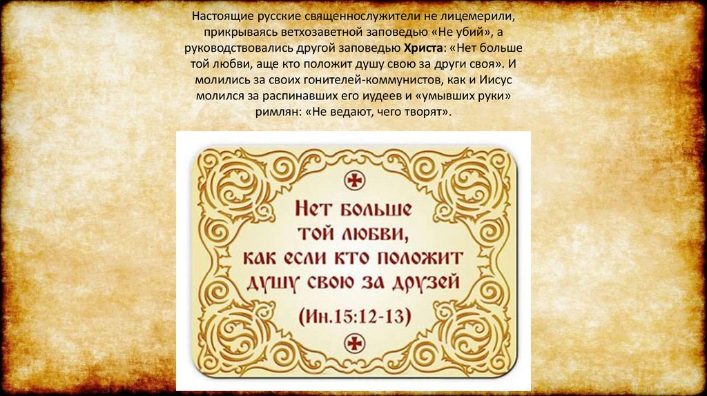 руководствовались другой заповедью Христа: «Нет больше