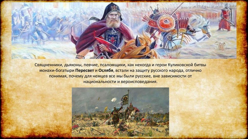 Свящненники, дьяконы, певчие, псаломщики, как некогда и герои Куликовской битвымонахи-богатыри Пересвет и Ослябя, встали на защиту русского народа, отлично
