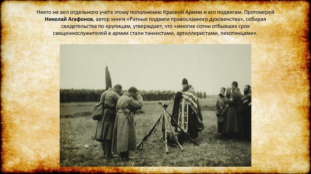 Никто не вел отдельного учета этому пополнению Красной Армии и его подвигам. ПротоиерейНиколай Агафонов, автор книги «Ратные подвиги православного духовенства», собирая