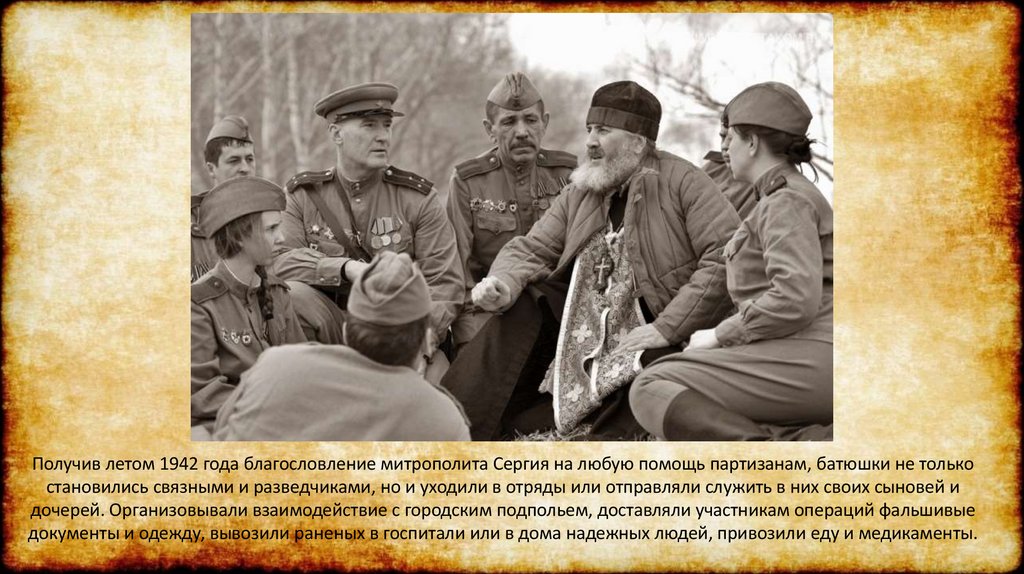 Получив летом 1942 года благословление митрополита Сергия на любую помощь партизанам, батюшки не толькостановились связными и разведчиками, но и уходили в отряды или отправляли служить в них своих сыновей и